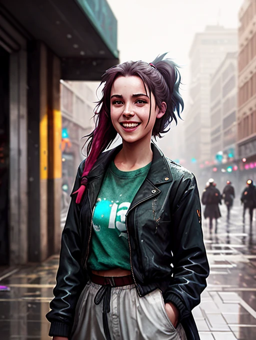 RAW photo, a close up portrait photo of 26 y.o woman in wastelander clothes, long haircut, pale skin, slim body, background is city ruins, (high detailed skin:1.2), 8k uhd, dslr, soft lighting, high quality, film grain, Fujifilm XT3